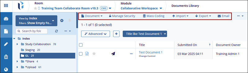 This menu is located at the top of the Documents module and allows access to various functionalities on documents: