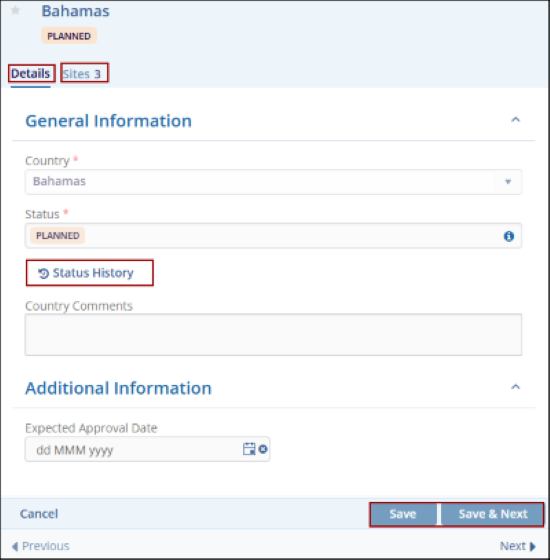 - Under General Information, update the Country name and Status if needed.