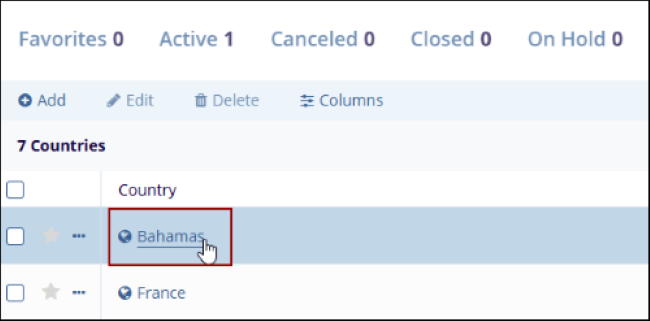 - On the Countries screen, click on the country name to edit.