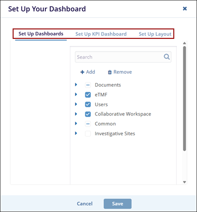 - The Set Up Your Dashboard window opens and displays the following options