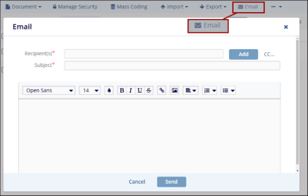 The email function allows users to send an email to another room user or contact which can be a document-related email or other.