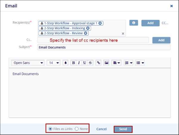 - Select the Files as Links radio button to share documents as links or select None if not required.