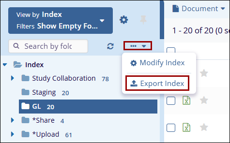 Export index allows to export the index structure of the room. Users can choose to export the index for the chosen folder or only the index outline. The index can be exported in either HTML, Microsoft Excel or Microsoft Word format. Besides these, users can also choose to export empty, or system folders as well as documents unpublished to the eTMF.