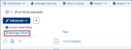 Click on the Advanced button and select the + Create New Filter option above the documents grid. The Create Filter window opens.