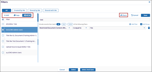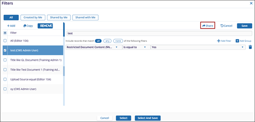 Users can view the filters that are created, shared by and shared with them by clicking the required tabs in the Filters window.