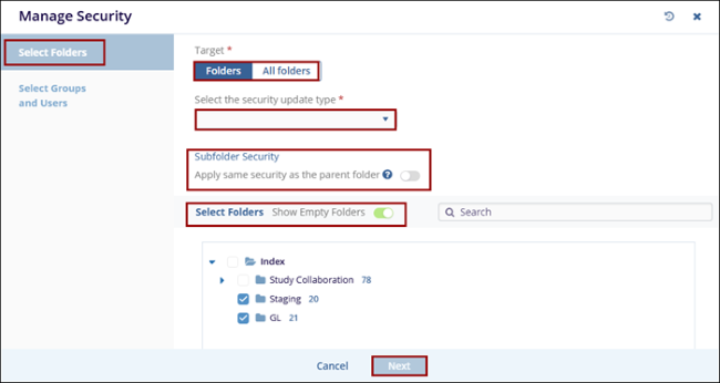 - Within the Target* section, click on the Folders tab and select the folders to apply security to. To search for a specific folder, enter the search term in the search box.