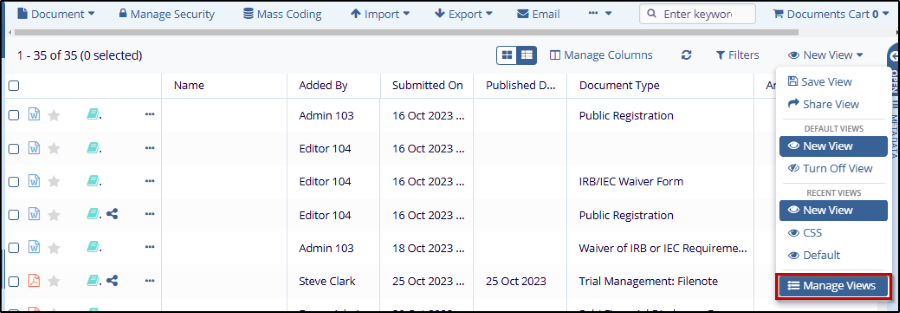 - Select the Manage Views option from the from the Views dropdown.