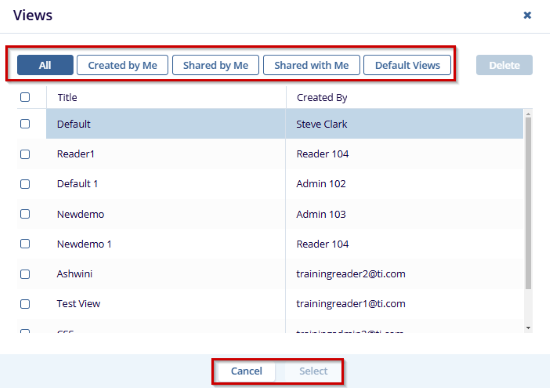 - To delete a view, select a view from the list and click the Delete button at the top right corner of the window.