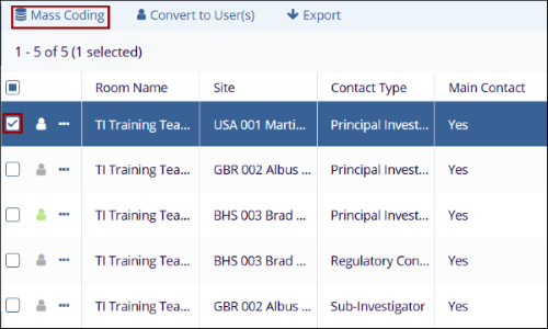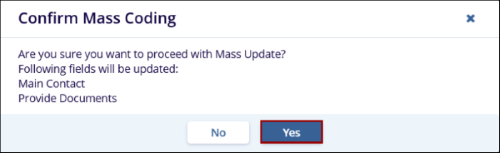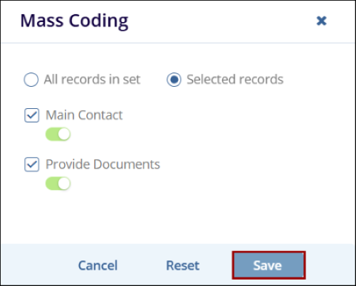 The Mass coding functionality allows users to apply metadata updates in bulk to all or selected contacts.
