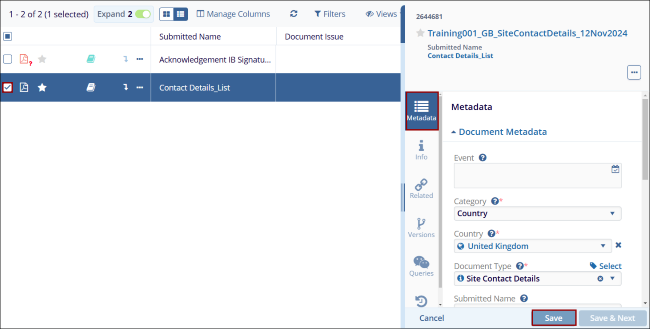 The Metadata tab in the Metadata panel displays all details entered during the document addition process. Users with the required permissions can edit metadata fields.