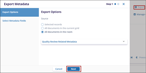 - If you choose to export Quality Review Related Metadata, indicate whether all information should be provided or only the information from the most recent Quality Review Profile.