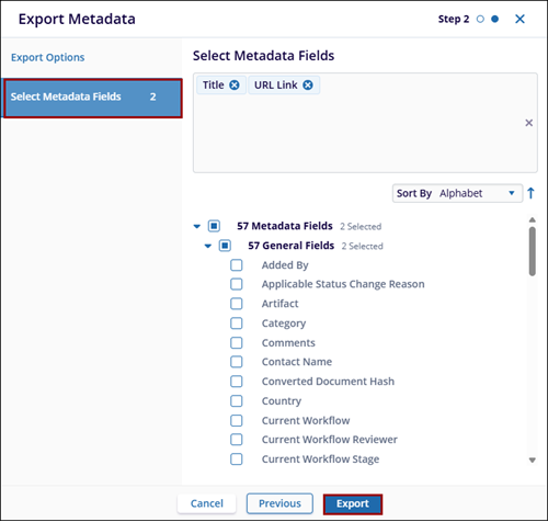 - Choose which metadata fields should be included in the export.