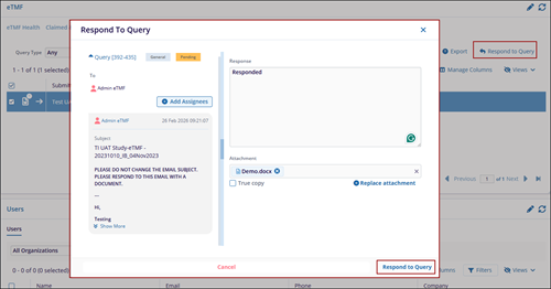 My Queries in the eTMF allows the users to view and manage queries related to the documents they are working on. Queries could be either sent (by the user to someone else) or received (from others to the user). This helps to track the status of queries and allows the user to take actions such as responding to or exporting query details.
