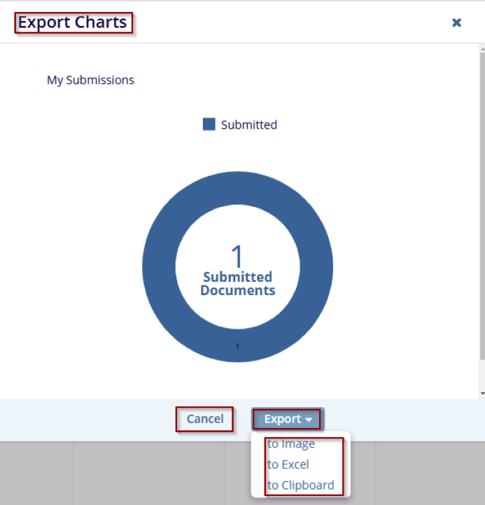 user can view the Submitted Documents Chart through the Donut, Bar, and Column view by