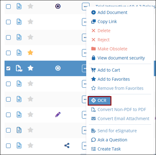 - Select the OCR option from the Document Activities menu.
