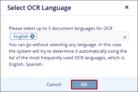 - On the Select OCR Language popup, select up to 5 languages for the OCR.