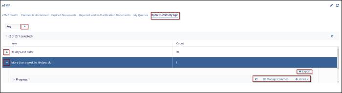 - Navigate to the eTMF dashboard, and select the Open Queries by Age tab.
