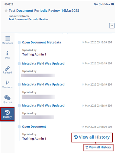 - Navigate to the History tab documents metadata panel and click