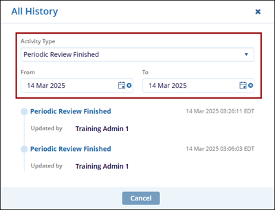 - On the All History tab, view all the periodic review actions.