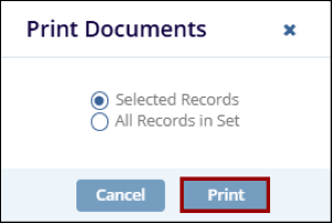 - On the Print Documents popup select either Selected Records or All Records in Set