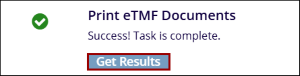 - On the Print eTMF Documents success message popup, click on the Get Results