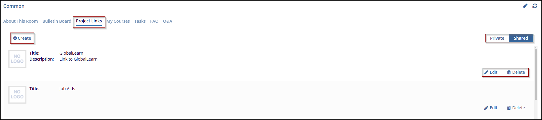 The Project Links tab displays links to various websites and resources used in the study, allowing team members quick access to important external content. Users with Editor-level permissions and above can create new links by clicking the Create button. Each link can be set as Private (visible only to the user) or Shared (visible to all users). This setup allows users to organize and manage external resources effectively.