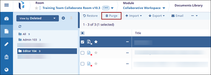 Once a document has been deleted, an administrator-level user will be able to navigate to the Deleted Documents view of the Documents module and, if desired, purge the document. Most deleted documents do not need to be purged from a study room unless necessitated by an internal SOP. However, some documents, such as those that contain PHI or PII, would likely be purged out of an abundance of caution.