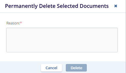 - Mandatorily provide a reason on the Permanently Delete Selected Documents popup.