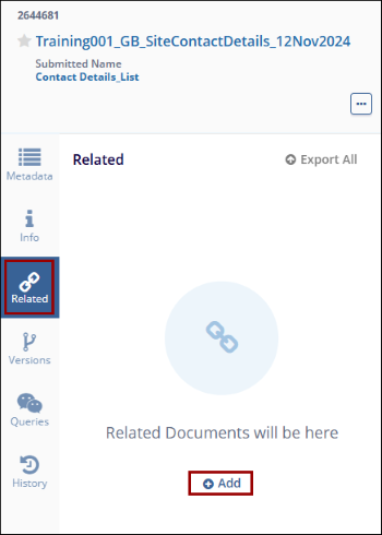 The Related tab in the Metadata panel displays all documents associated with a specific document. Users can also add additional related documents from this section.