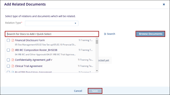 Select the Related Type from the dropdown options and the document using the Quick Select functionality else click on the Browse Documents button.
