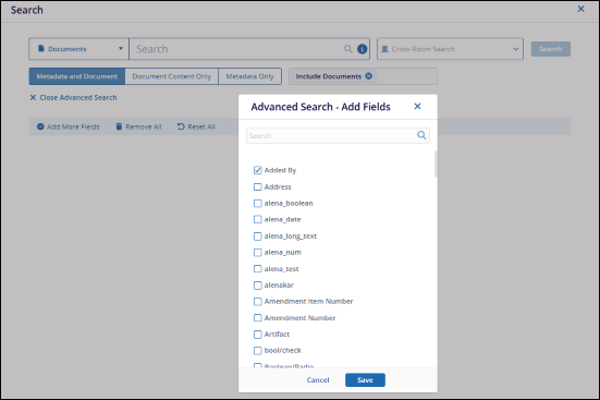 - After selecting the desired fields, click the Save button. The selected fields will now be added to the Advanced Search interface.