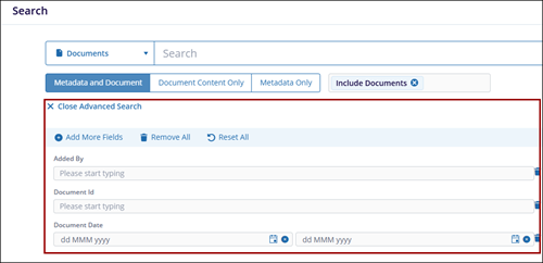 Advanced Search allows users to refine search results by applying specific criteria, helping return more accurate and relevant information. This option is available from the Search Bar > Advanced Search > Add Fields, where users can select additional fields to define search parameters based on specific data attributes. Available advanced search fields include: