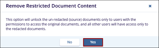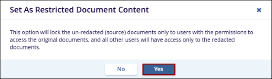 The Set as Restricted Document Content option locks the un-redacted (source) documents only to users with the permissions to access the original documents. All other users will have access only to the redacted documents.