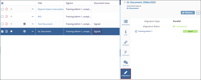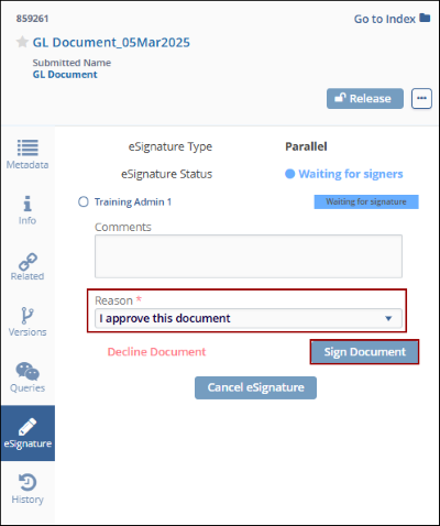 - Select the eSignature tab in the metadata panel and enter a reason from the available dropdown options.