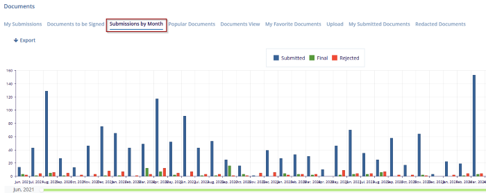 In the Documents dashlet, select Submissions by Month from the menu at the top. This view displays a bar chart representing the number of document submissions per month, categorized by submission status.