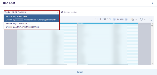 - Select a document from the grid and click the Versions tab from the Metadata panel.