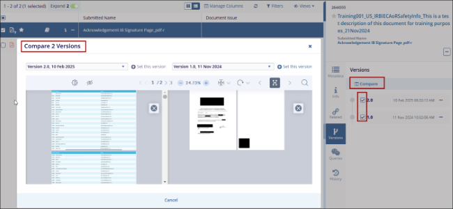 The Versions tab allows users to view and compare the different versions of a document. This is most commonly applicable in Trial Interactive rooms such as TI Collaborate rooms where documents are created, edited, and reviewed before becoming effective. However, this can also apply to a study room where expired or expiring documents have been replaced with newer copies.