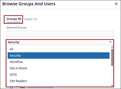 - On the Groups tab, use the dropdown menu to filter groups by category.