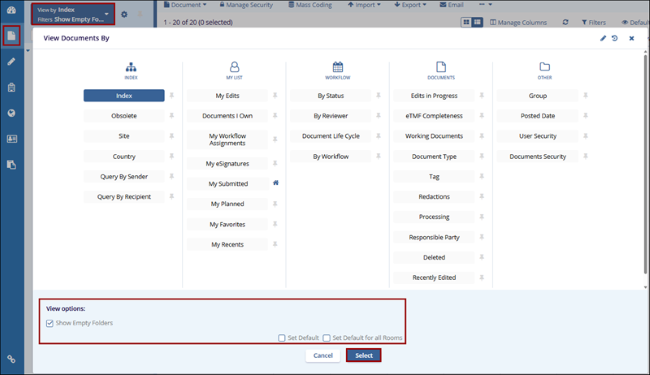 - Open the Documents Library modal from the left-hand navigation pane and click the View By dropdown. The index view is applied by default.