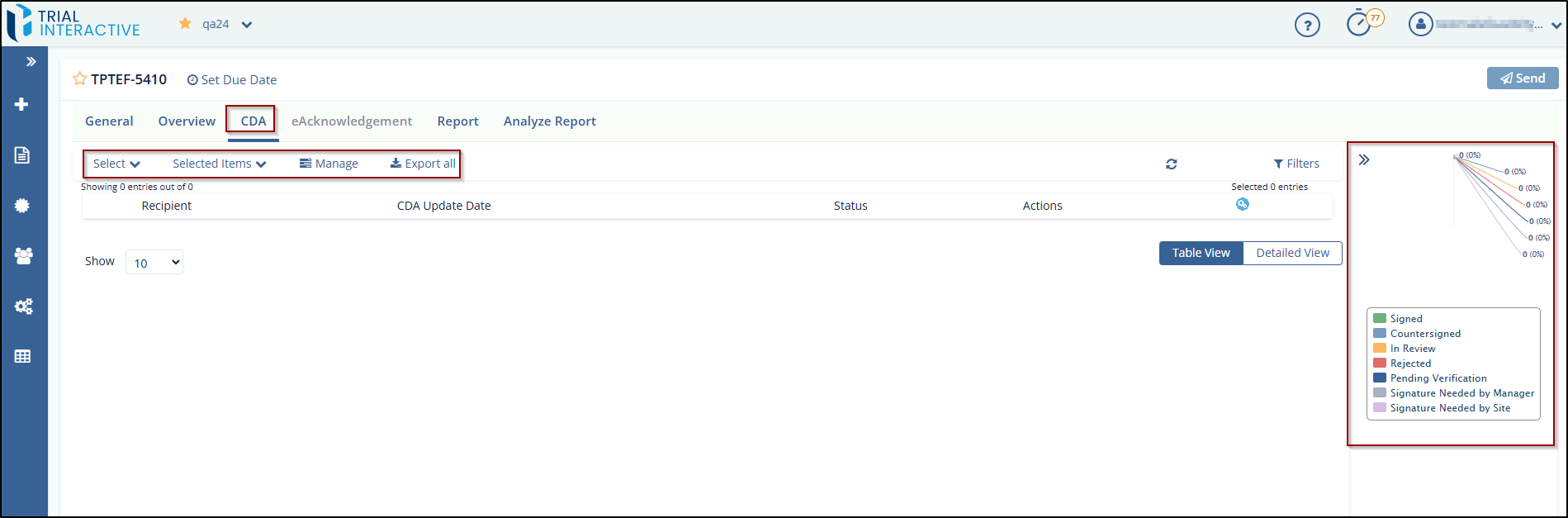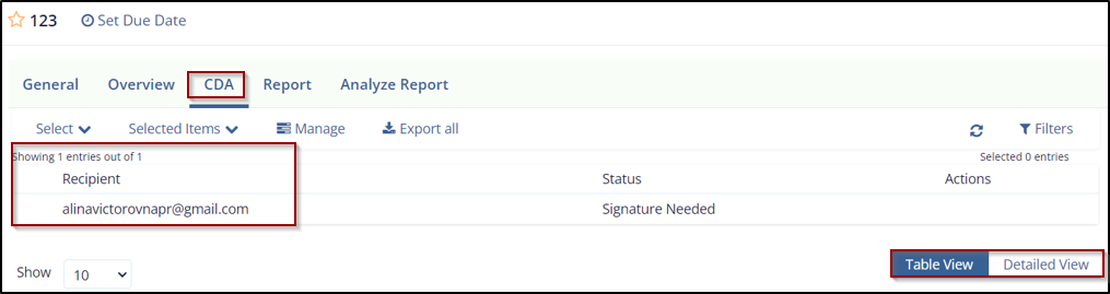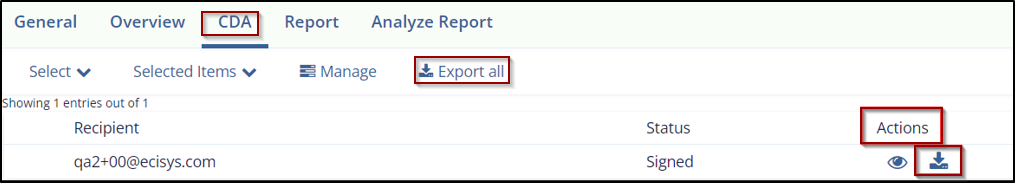 When the submitter signs the CDA and sends it to the Manager for countersignature, the Manager receives an email notification and can also access and sign the CDA directly from the CDA tab. From this tab, the Manager can perform the following actions: