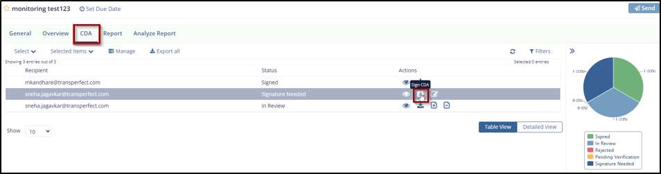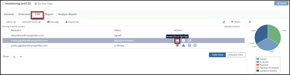 Click the eye icon below in the Actions column of the recipient to review and sign the CDA. The manager can perform the following actions on CDA for different Statuses: