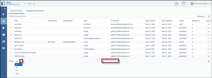 - Select the number of entries (10, 25, 50, or 100) to display per page on the Forms Dashboard.