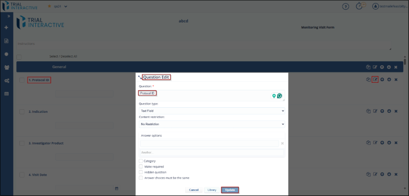 - In the form that is displayed, click the Edit icon displayed at the right corner for each field. The Question Edit popup window is displayed.