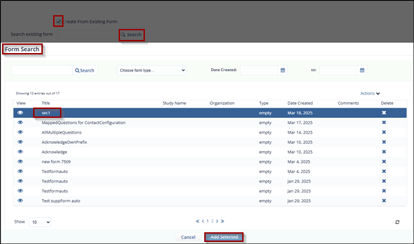 - Click the Add Selected button to copy all fields from the selected form to the new form. The Add Selected button is disabled by default and becomes active only when a form is selected.