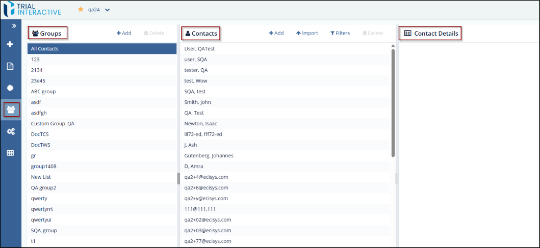 Contacts are the members in a Survey. You can add, edit and delete the contact/groups.