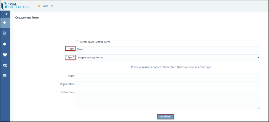Click the New Form icon displayed in the left panel. The Create New Form window is displayed.