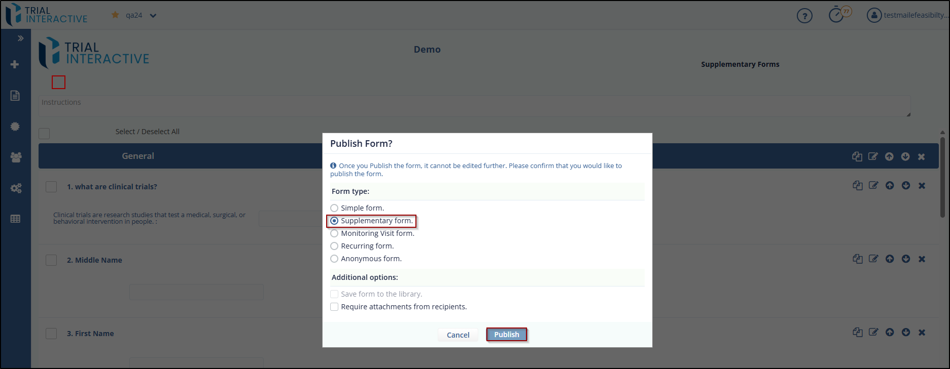 - Click the Publish button displayed at the bottom of the screen. You can add a question and a section to the supplementary form by clicking the buttons – Add Question and Add Section, displayed vertically in the right corner.