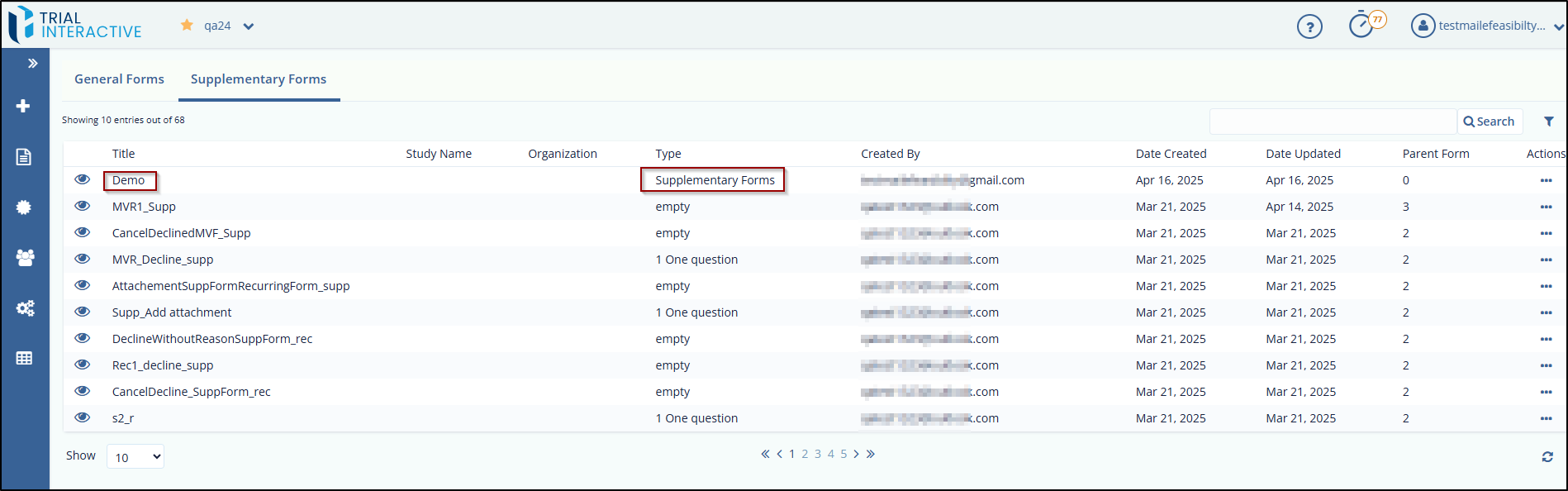 The Supplementary Forms tab displays additional or supporting forms that are linked to primary forms within the system.