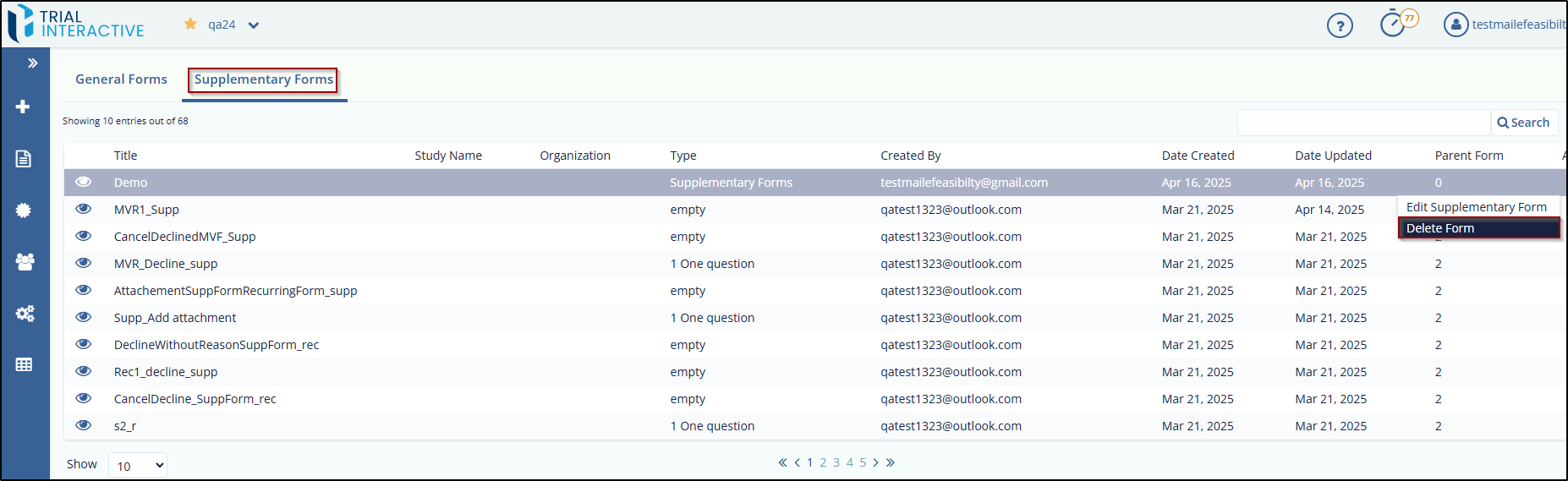 - The Edit Supplementary Form and Delete Form options are displayed.