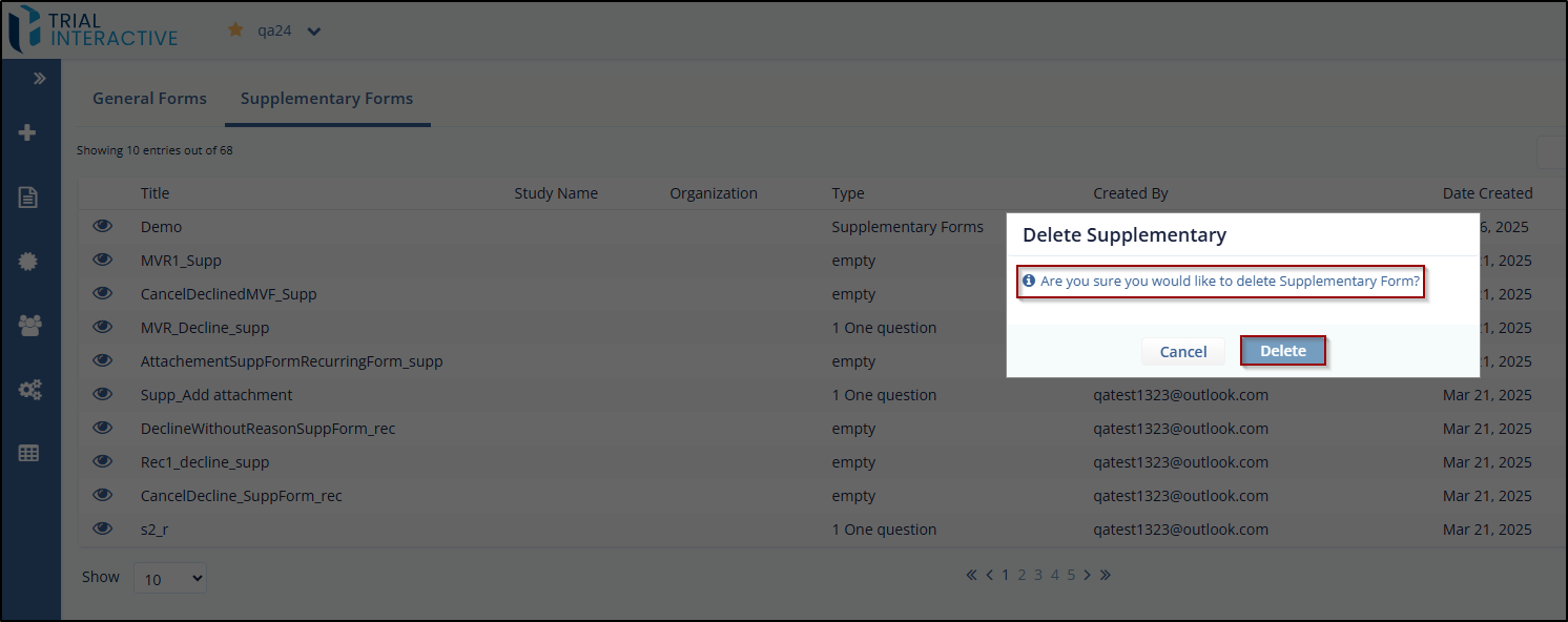 - A Delete Supplementary popup window is displayed with the following question – Are you sure you would like to delete the Supplementary form?